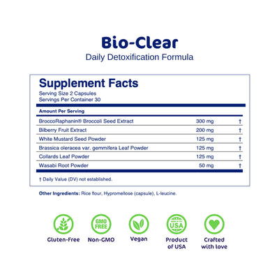 Everyday we get bombarded with dangerous toxins that quietly wreak havoc on our bodies. They’re in our food, drinks, water, and household products. Even most so-called healthy foods are infested with toxins. The consequence of toxicity is: • Chronic inflammation • Accelerated aging • Allergies • Various diseases • Physical development • Cognitive impairment. Fortunately, we created a supplement that detoxes the body on a daily basis; healing you from any damage already done and fortifying your body's ability to defend itself from toxins. Bio-Clear stimulates nature’s most potent detoxification substance ever identified, sulforaphane. We recommend that this key supplement be taken daily to help your body clear out harmful toxins.