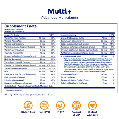 Our bodies use nutrients, vitamins, and minerals as fuel to develop optimal levels of strength, energy, cognition, and vitality. The problem is it’s nearly impossible to get the proper amount of nutrients through diet alone. And the majority of multivitamins don’t supply nearly enough variety or potency to be sufficient. Plus, due to the way most multivitamins are formulated; our bodies struggle to absorb what little nutrients, vitamins and minerals they have to offer. That’s why we created Multi+. It’s the most robust and bioavailable (easy-to-absorb) multivitamin on the market.